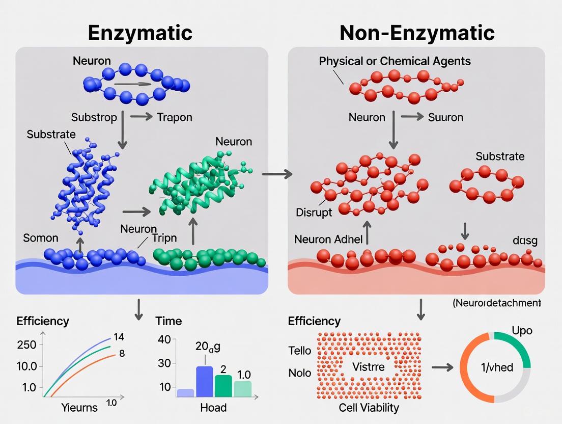 Enzymatic detachment utilizes proteolytic enzymes to cleave specific protein domains that mediate cell-ECM and cell-cell adhesions. The most commonly used enzymes in neuronal research include: