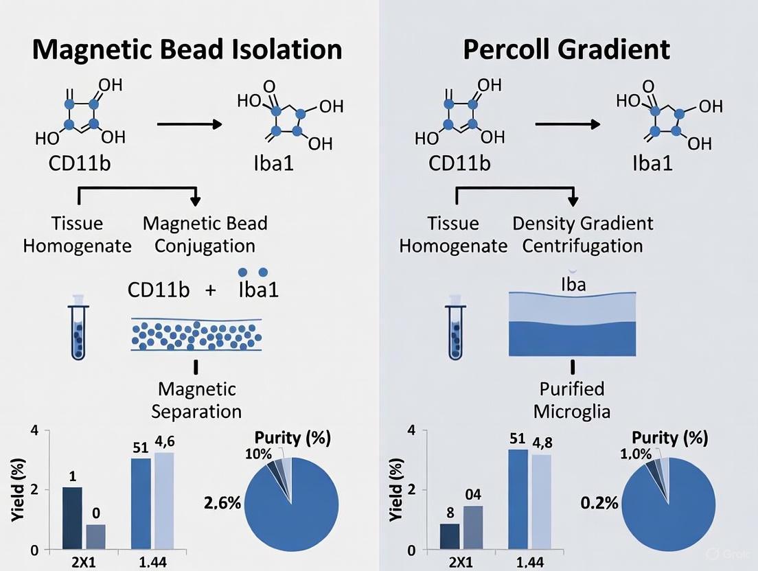 This guide provides an objective comparison of two fundamental microglia isolation techniques—magnetic bead isolation and Percoll gradient centrifugation—evaluating their performance based on purity, yield, viability, and technical requirements to inform researchers' methodological selections.