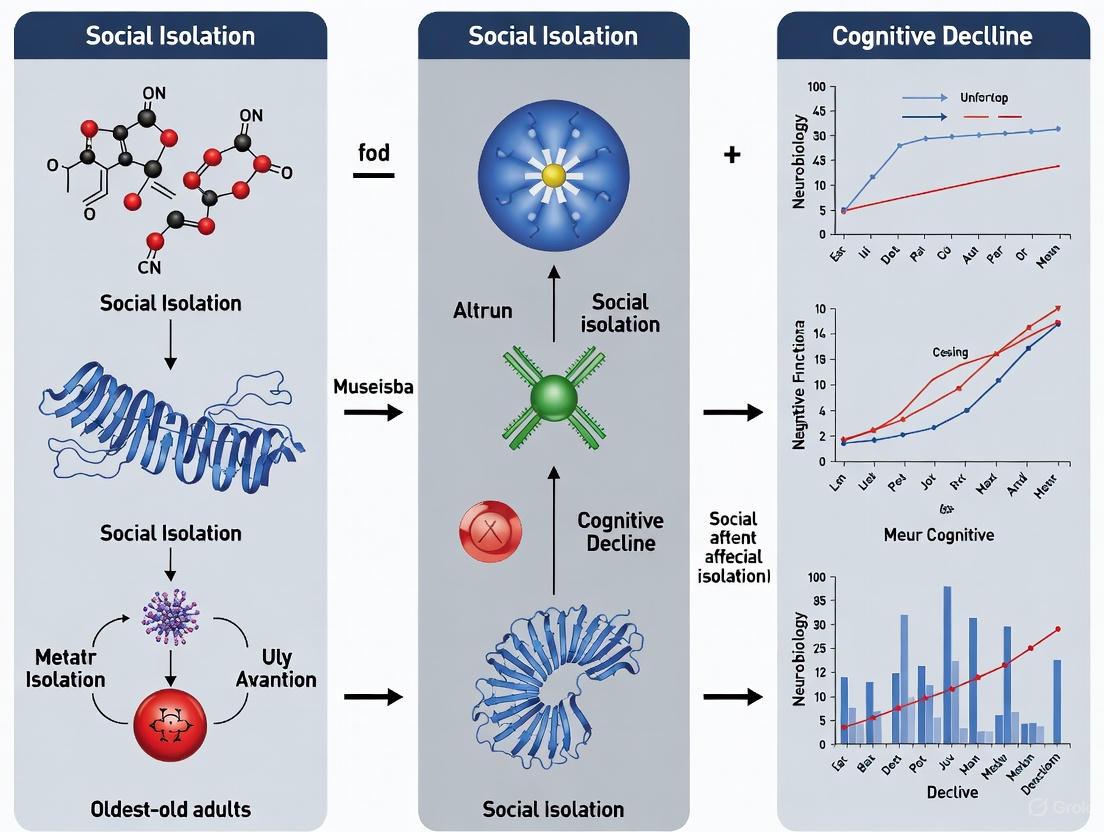 Social isolation affects approximately one-third of the oldest-old population globally, with prevalence escalating in those with advanced age, functional limitations, and lower socioeconomic resources. The substantial public health burden manifests through elevated risks for cognitive decline, dementia, mortality, and significant economic costs. Research initiatives should prioritize the development and validation of standardized assessment protocols, elucidation of underlying biomechanisms, and implementation of multilevel interventions that address both individual and environmental determinants. For drug development professionals, these findings highlight the importance of considering social health determinants in clinical trial design and the potential for novel therapeutics targeting the stress-inflammatory pathways linking social isolation to cognitive impairment. Future research should focus on longitudinal studies tracking the progression from social isolation to cognitive decline and randomized trials testing mechanism-targeted interventions.