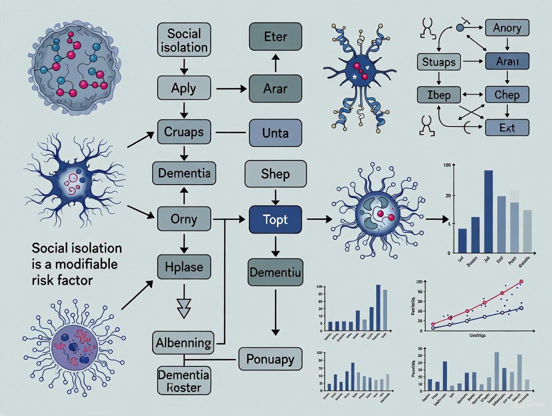 For researchers and drug development professionals, these findings highlight the importance of considering social environmental factors alongside biomedical approaches to dementia risk reduction. Future research should prioritize the development of standardized measurement approaches, elucidate the efficacy of isolation-reduction interventions for cognitive outcomes, and explore potential synergistic effects with pharmacological approaches. The evidence strongly supports the integration of social connection strategies into comprehensive dementia risk reduction frameworks.
